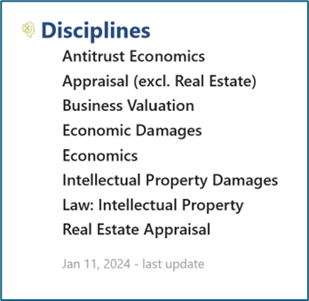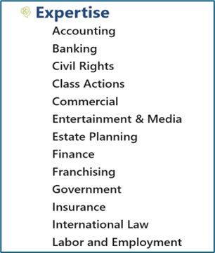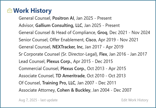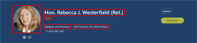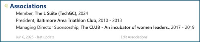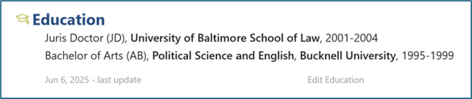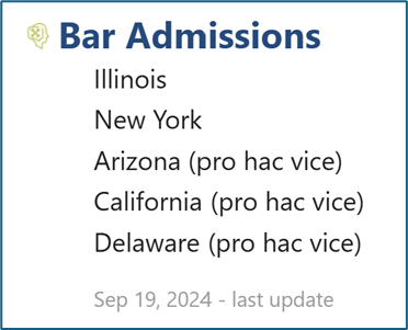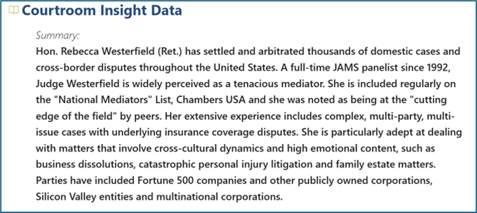 Every CI Biography is structured to help users assess a legal professional’s expertise, background, and case-related insights. Each section’s visibility depends on what information on each professional is available. A CI Biography includes the following sections: