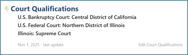 Captures a legal professional’s admissions and authorizations to practice before specific courts, including details such as:
