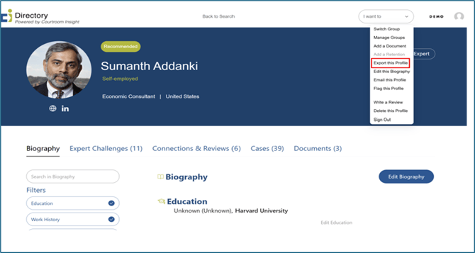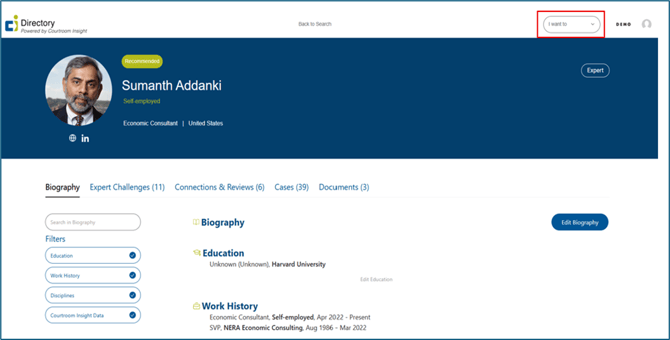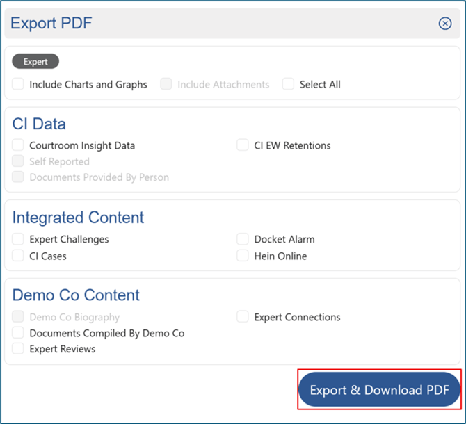 CI allows users to quickly generate a PDF version of any attorney, expert, judge, or neutral profile. The PDF export includes all key information displayed on the profile page, making it easy to print, share, or save offline. This article walks you through how to locate the export option and download a PDF directly from the profile view.