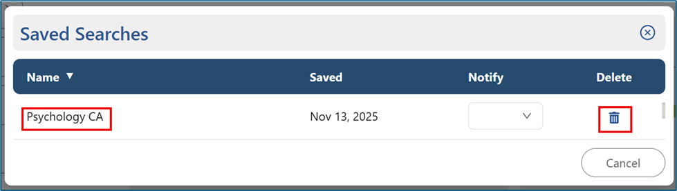 To delete a saved search, click the trash-can icon on the right side.