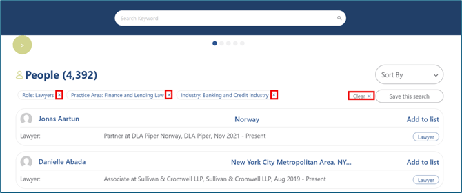 - For example, select Finance and Lending Law under Practice Areas, then select Banking and Credit under Industry to return profiles that match both filters.