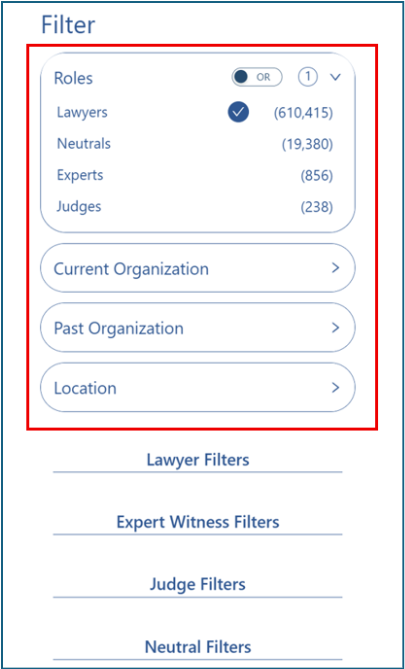On the left-hand search panel, below the general filters, are the role-specific filters. These let you narrow your search by role (lawyer, expert, judge, or neutral), with each filter set tailored to the details most relevant to that role.